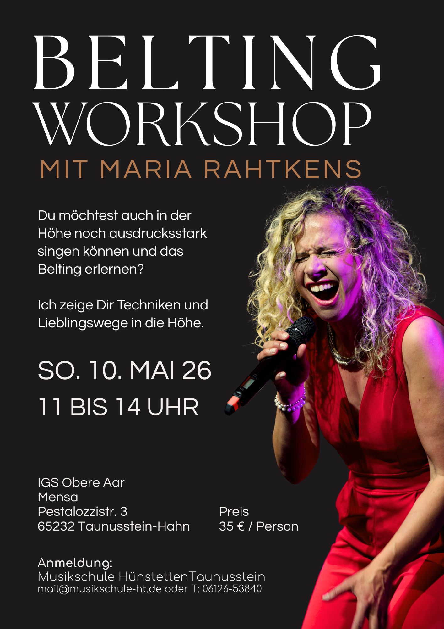 Du möchtest auch in der Höhe noch ausdrucksstark singen können und das Belting erlernen? Maria Rahtkens zeigt Dir Techniken und Lieblingswege in die Höhe. Anmeldungen über mail@musikschule-ht.de oder T: 06126-53840