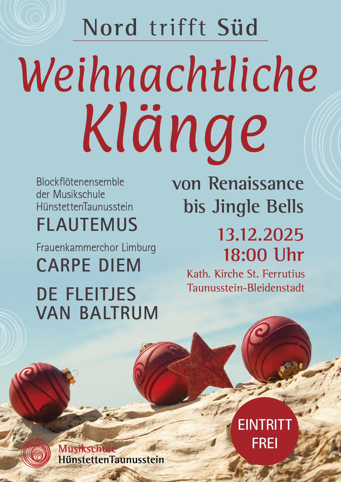 Weihnachtliche Klänge mit dem Blockflötenensemble FLAUTEMUS der Musikschule HünstettenTaunusstein, dem Frauenkammerchor CARPE DIEM LIMBURG und DE FLEITJES VAN BALTRUM in der Kath. Kirche St. Ferrutius in Taunusstein-Bleidenstadt. Unter dem Motto "Nord trifft Süd" werden in diesem Konzert weihnachtliche Klänge von der Renaissance bis Jingle Bells präsentiert. Der Eintritt ist frei - Gäste sind herzlich Willkommen.