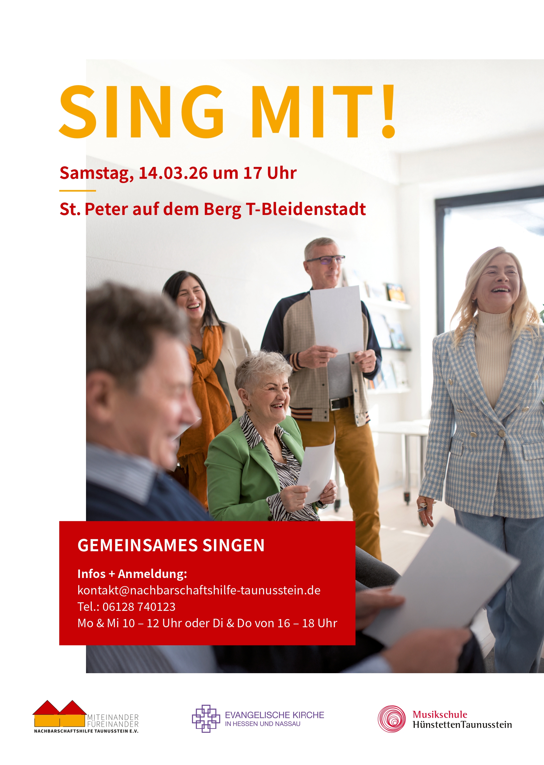 Gemeinsames Singen erleben - ohne Vorkenntnisse! Eine Veranstaltung in Kooperation mit der Nachbarschaftshilfe Taunusstein und der Ev. Kirche Taunusstein in der Ev. Kirche St. Peter auf dem Berg in T-Bleidenstadt. Infos + Anmeldung: kontakt@nachbarschaftshilfe-taunusstein.de