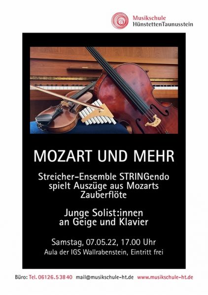 Das Streicher-Ensemble STINGendo spielt Auszüge aus der Zauberflöte von Wolfgang Amadeus Mozart. Des Weiteren spielen junge Solist:innen an Geige und Klavier. Der Eintritt ist frei.