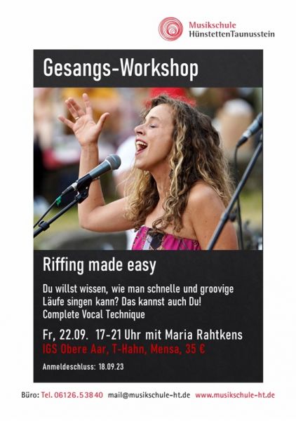 Du willst wissen, wie man schnelle und groovige Läufe singen kann? Das kannst auch Du! Lerne Riffing mit der Complete Vocal Technique unter der Anleitung unserer Gesangslehrerin Maria Rahtkens. Bei Interesse kann außerdem eine Masterclass gebucht werden. Der Workshop findet am Freitag, 22. September in der Zeit von 17-21.00 Uhr in der Mensa der IGS Taunusstein-Hahn statt (Teilnahmegebühr: 35 €), Anmeldeschluss ist der 18.09.2023, weitere Infos erteilt gerne das Musikschulbüro unter T: 06126-53840 oder mail@musikschule-ht.de